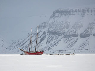 2009-05-05 En lyckad jakt I de branta klippsluttningarna ovanför tältplatsen är det full fart och ett väldigt liv på fåglarna på morgonen. Vinden har avtagit, temperaturen klivit ner under nollan och det är lite snö i luften. Spänner in oss i pulkorna och så börjar ett par svettiga timmar. Först ta sig upp över moränåsarna och sedan 5 kilometer konstant uppför, 500 höjdmeter. Saktliga jobbar vi oss upp över glaciären. Efter ett tag ser jag hur solen tränger igenom här och var och har fina ljusspel på de vita bergssidorna. Till slut flackar backen ut och högsta punkten är nådd. Härifrån ser man ner längs nästa glaciär till Tempelfjorden. Där lyser solen på en vit, istäckt fjord. Vilken lättnad! Stighudarna åker av och vi glider (jag glider och Ronja springer) ner mot fjorden. En bit bort ligger en stor segelbåt infrusen i isen och ett antal hundspann rör sig mot den. Molnen kommer och går, när solen lyser upp de stora Tuna- och Von Post-breen skimmrar de vackert turquois-blå där de mynnar ut längst inne i fjorden. Vi passerar färska björnspår, Ronja har fullt upp - spana draghundar, sniffa isbjörnspår och leta upp sälhål. Lite varstans syns sälar på isen. Plötsligt hittar Ronja ett mycket spännande hål. Tydligt är att det leder björnspår hit, samt att snön runt hålet är blodröd och så går det björnspår bort från hålet med tydliga släpmärken längs med dessa spår. Helt klart finns det en mätt isbjörn här i fjorden, för de spåren var inte gamla. Vi korsar fjorden och fortsätter en bit upp i Sassendalen där vi stannar för natten.