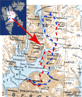 Min plan är att under en knapp månad uppleva Spetsbergen. Flyget går från Trondheim den 13 april och landar i Longyearbyen. Sedan är det bara att packa pulkan, på med skidorna, hämta turtillståndet från Sysselmannen och ge sig av. Min trogna följeslagare Ronja (hund) är med. Med varsin pulka fullpackad med mat och utrustning bär det av. Jag tycker om att ha en plan, ett mål, när jag ger mig ut på tur. Så planen är att skida mot Svalbards högsta topp, Newtontoppen (1713 möh). Om allt känns bra, väder och vind tillåter så kommer vi dit (rödstreckad linje kartan). Om det känns väldigt bra så fortsätter vi norrut till Perriertoppen (1712 möh) innan vi vänder tillbaka till Longyearbyen (blåstreckad linje kartan). Om det inte känns bra så får vi tänka om, korta ner turen och ha fyra sköna uteveckor i storslagen natur.